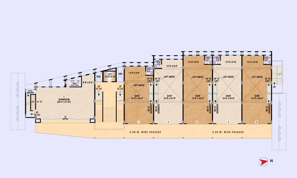 The complex has well appointed spaces for restaurants, shops and offices along with provision for storage space in basements and lofts for each unit.